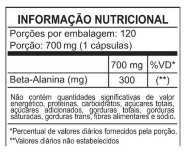 Beta-Alanina. Composição da cápsula: Gelatina e umectante glicerina.