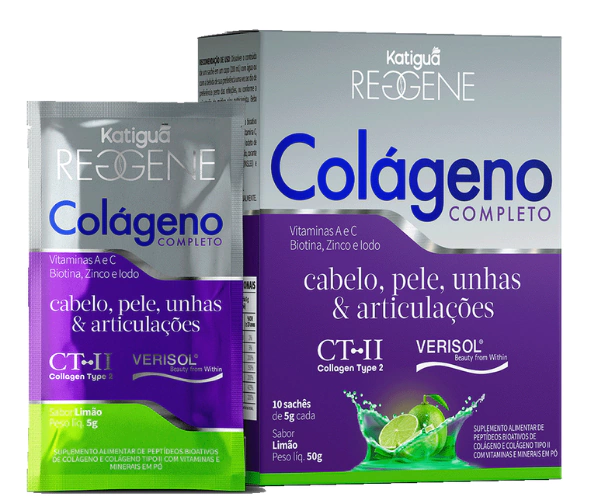 Colágeno Verisol é um suplemento alimentar em pó, formulado com peptídeos bioativos de colágeno e colágeno do tipo II, vitaminas A e C e os minerais Zinco e lodo, sendo um produto pertencente à categoria de nutrição e fabricado por Katiguá. Apresentado em embalagem com 10 sachês de 5g cada, esse é produto de administração por via oral destinado a adultos. Nessa versão, o sabor apresentado é de limão.