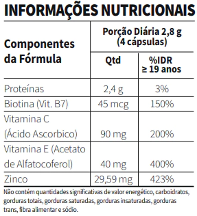 VITAMINAS : VITC, BIOTINA, VITAMINA E, e o ZINCO sinergismo de vitaminas importantes para o processo regenerativo e fortalecimento dos tecidos.