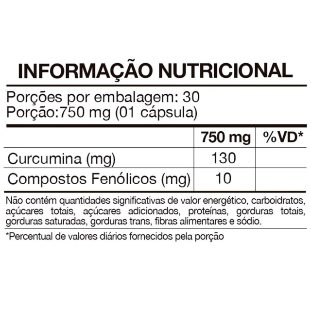Extrato de Rizomas de Cúrcuma longa, Silicato de Magnésio, Dióxido de Silício Coloidal, Estearato de Magnésio e Carbonato de Cálcio. Composição da Cápsula: Gelatina, Glicerina Bidestilada