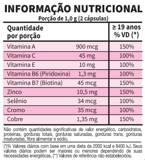 : Vitamina A, Vitamina C, Vitamina E, Vitamina B6 (Piridoxina), Vitamina B7 (Biotina), Óxido de Zinco, Selenito de Sódio, Picolinato de Cromo, Bisglicinato de Cobre, Dióxido de Silício Coloidal, Estearato de Magnésio e Carbonato de Cálcio. Composição da cápsula: Gelatina, Glicerina, Corante Vermelho Bordeaux, Dióxido de Titânio e Água Purificada. ALÉRGICOS: NÃO CONTÉM GLÚTEN.