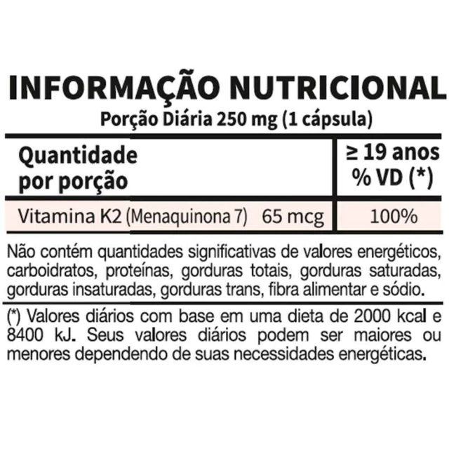 Vitamina K2 (Menaquinona 7), Dióxi- do de Silício Coloidal, Lecitina de Soja e Óleo de Giras- sol. Composição da cápsula: Gelatina, Glicerina, Sorbitol 70% e Água Purificada.