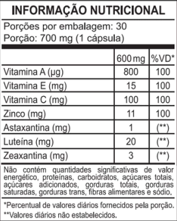 Luteína, astaxantina (Asta), zeaxantina (Zean), vitaminas A, C e E, e outros excipientes.