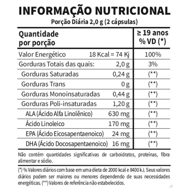 Óleo de Peixe (Ômega 3), Óleo de Chia e Óleo de Linhaça. Composição da cápsula: Gelatina, Glicerina, Sorbitol e Água Purificada.