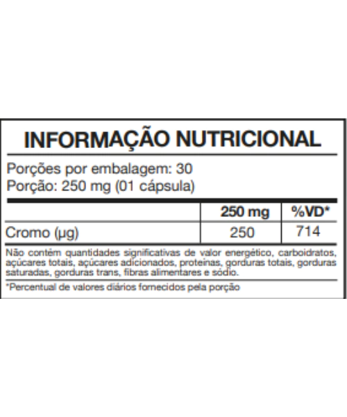 Formulado com Picolinato de Cromo, o produto age sobre o metabolismo da glicose pelas células, aumentando a sensação de saciedade à medida que faz o indivíduo reduzir o consumo de alimentos ricos em açúcar. É isento de açúcares, glúten, sal e lactose, sendo um produto com 0% de calorias e valor energético, além de ser melhor absorvido devido ao mineral cromo. Auxilia o organismo na perda de peso.